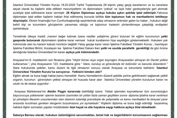 "İstanbul Üniversitesi Yönetim Kurulu 18.03.2025 Tarihli Toplantısında 28 kişinin yatay geçiş kararlarının ve bu kararlara dayalı olarak bu kişilerin elde ettikleri mezuniyetlerin ve diplomaların 'yokluk' ve 'açık hata' gerekçeleriyle geri alınmak suretiyle iptal edilmesine karar vermiştir. 28 Kişinin Diploması açıkça hukuka aykırı şekilde iptal edilmiştir.Yalnızca diplomaları iptal edilen kişilerin hakları ihlal edilmemiş bununla birlikte tüm toplumun hak ve menfaatlerini tehlikeye düşmüştür. Ekrem İmamoğlu’nun Cumhurbaşkanlığı seçimlerinde aday olmasının ardından gelen bu haber , hukukun değil belirli kişi ve kurumların görüşlerinin yansıması olduğu ve toplumun iradesini yönlendirmeye çalışıldığı endişeleri içerisindeyiz.