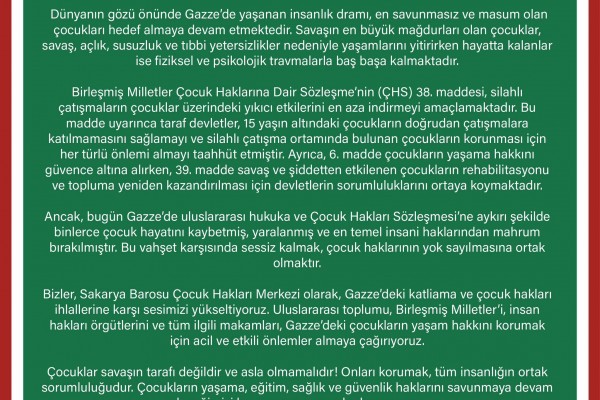 Bizler, Sakarya Barosu Çocuk Hakları Merkezi olarak, Gazze’deki katliama ve çocuk hakları ihlallerine karşı sesimizi yükseltiyoruz. Uluslararası toplumu, Birleşmiş Milletler’i, insan hakları örgütlerini ve tüm ilgili makamları, Gazze’deki çocukların yaşam hakkını korumak için acil ve etkili önlemler almaya çağırıyoruz.