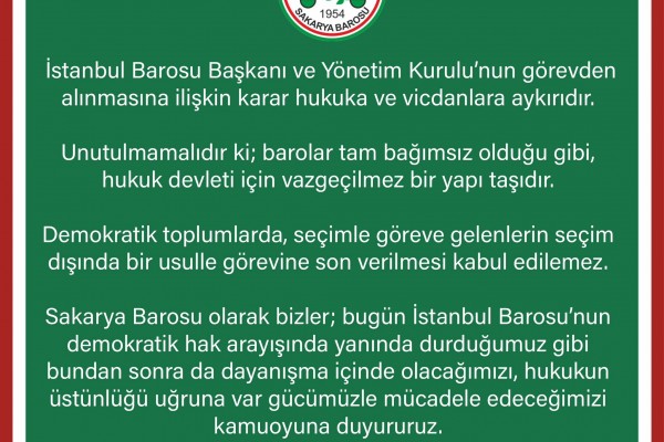 Sakarya Barosu olarak bizler; bugün İstanbul Barosu’nun demokratik hak arayışında yanında durduğumuz gibi bundan sonra da dayanışma içinde olacağımızı, hukukun üstünlüğü uğruna var gücümüzle mücadele edeceğimizi kamuoyuna duyururuz.