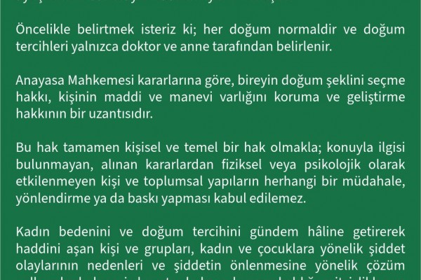 Kadın bedenini ve doğum tercihini gündem hâline getirerek haddini aşan kişi ve grupları, kadın ve çocuklara yönelik şiddet olaylarının nedenleri ve şiddetin önlenmesine yönelik çözüm yolları, kadınların iş hayatında karşı karşıya kaldığı eşitsizlikler ve daha pek çok gerçek sorunun çözümü için çaba göstermeye davet ediyoruz.