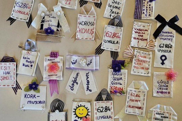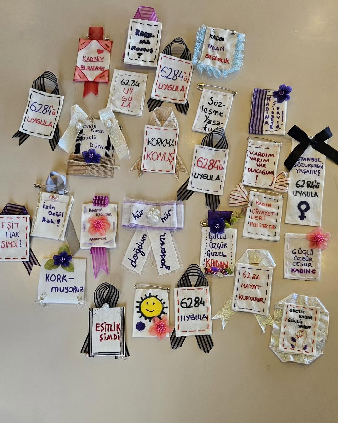 Etkinlikte, kadın haklarına dikkat çeken sloganlar kumaş rozetlere dönüşerek hem farkındalık yaratılmış hem de anlamlı bir dayanışma örneği sergilenmiştir.