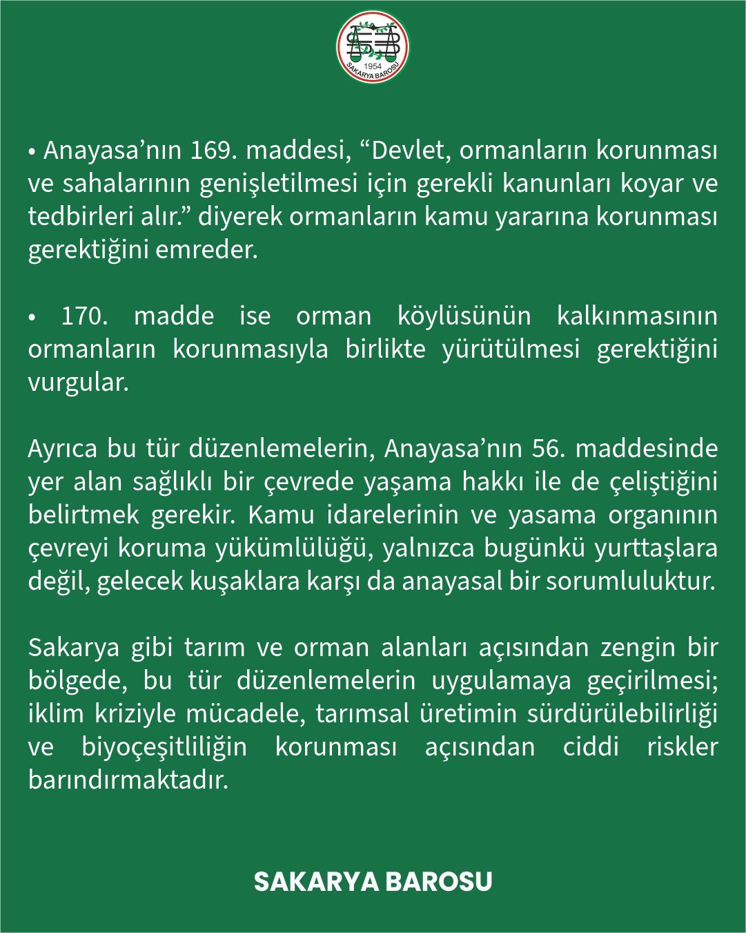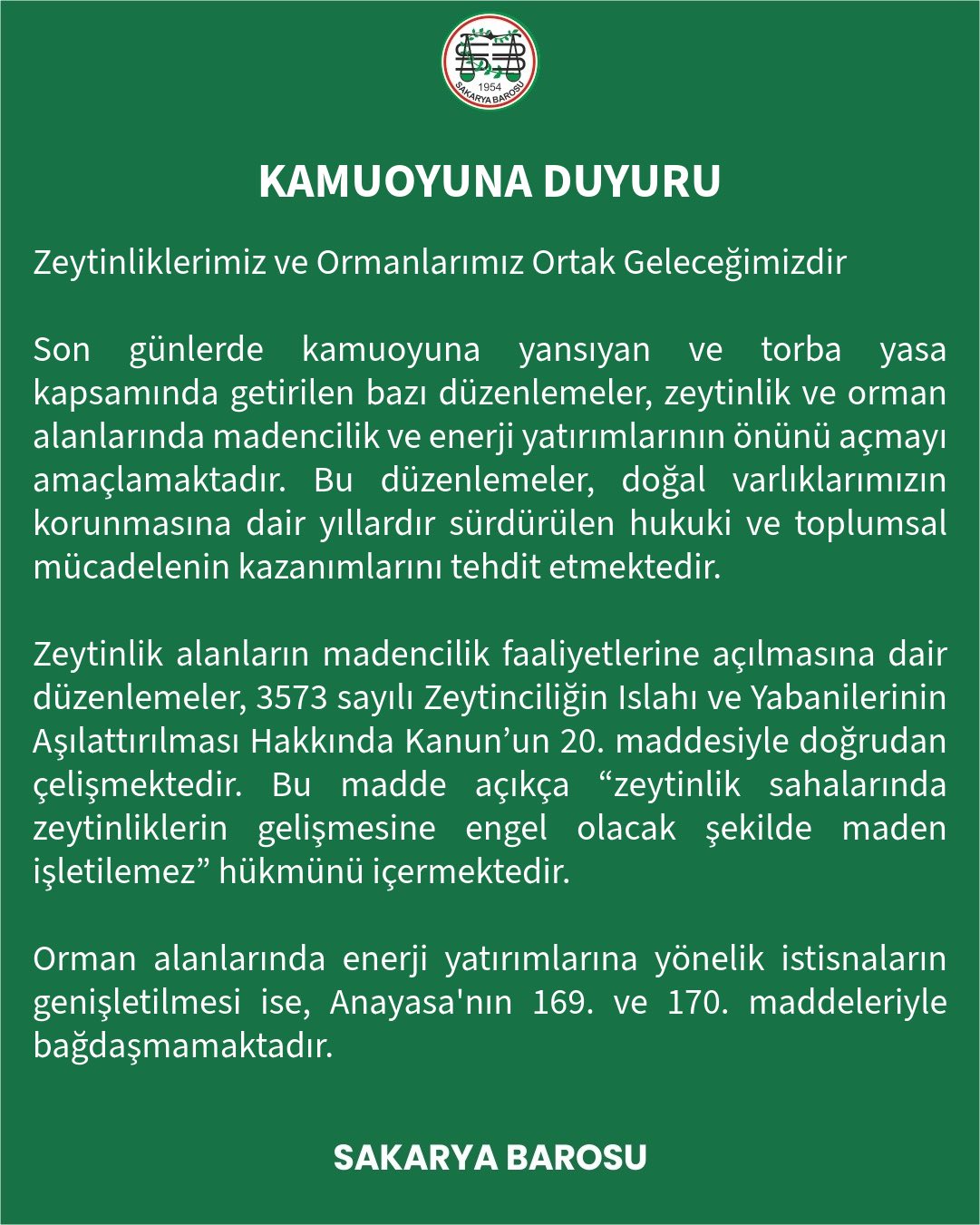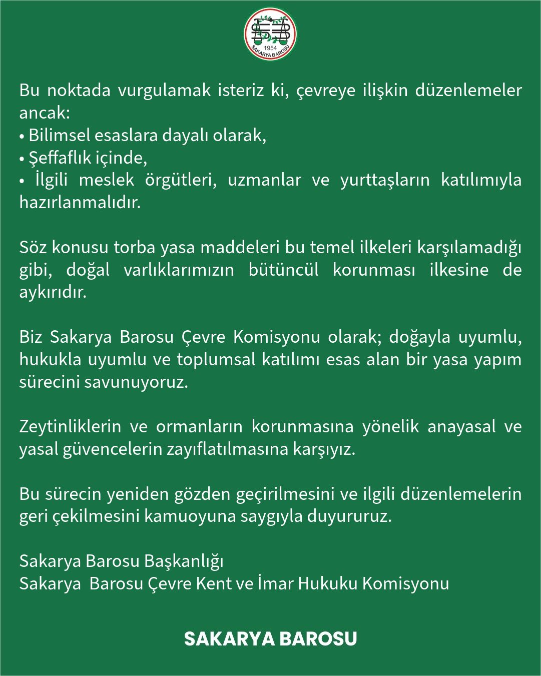 Biz Sakarya Barosu Çevre Komisyonu olarak; doğayla uyumlu, hukukla uyumlu ve toplumsal katılımı esas alan bir yasa yapım sürecini savunuyoruz.