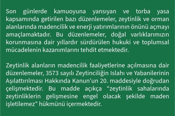 Zeytinliklerin ve ormanların korunmasına yönelik anayasal ve yasal güvencelerin zayıflatılmasına karşıyız.