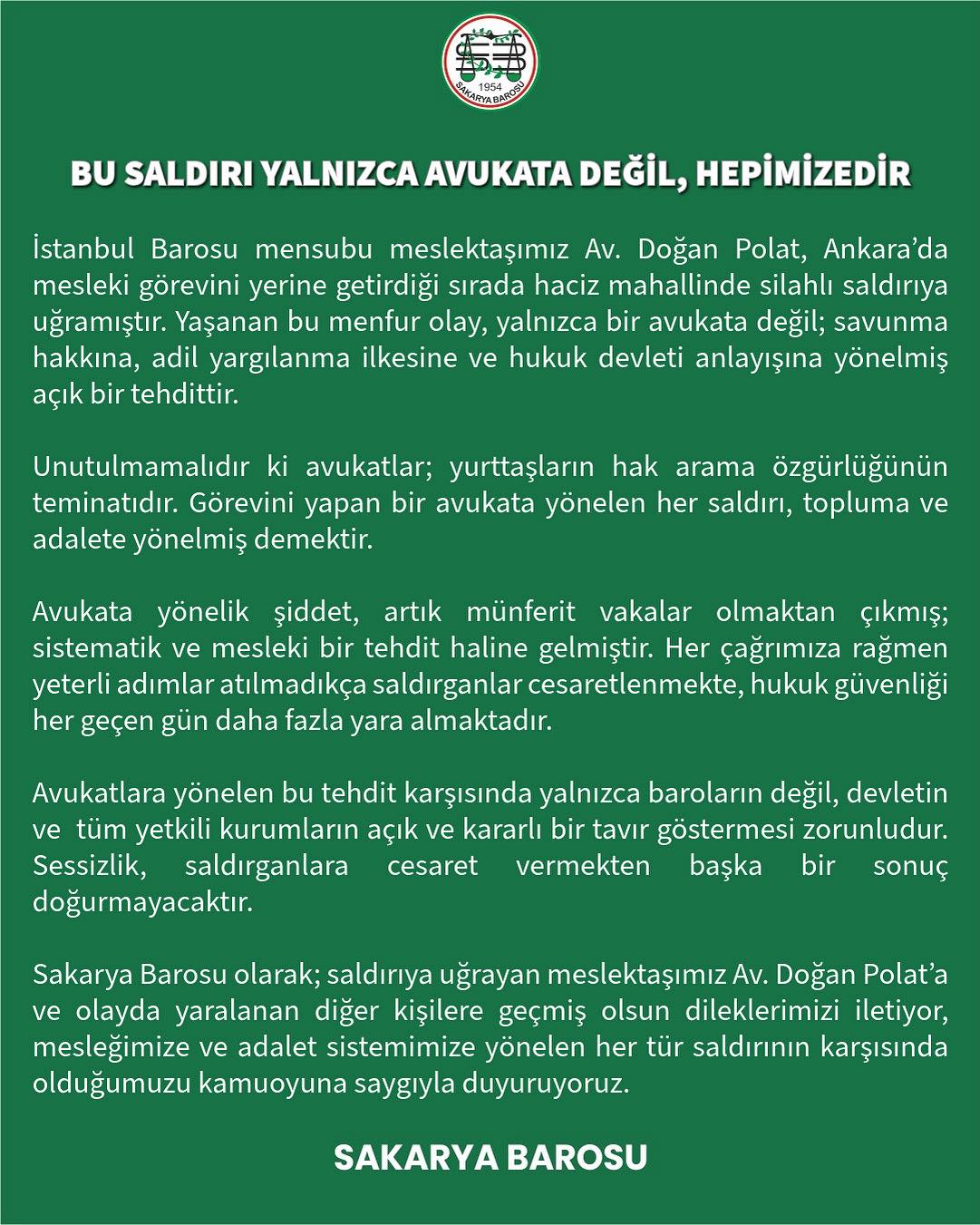Sakarya Barosu olarak; saldırıya uğrayan meslektaşımız Av. Doğan Polat’a ve olayda yaralanan diğer kişilere geçmiş olsun dileklerimizi iletiyor, mesleğimize ve adalet sistemimize yönelen her tür saldırının karşısında olduğumuzu kamuoyuna saygıyla duyuruyoruz.