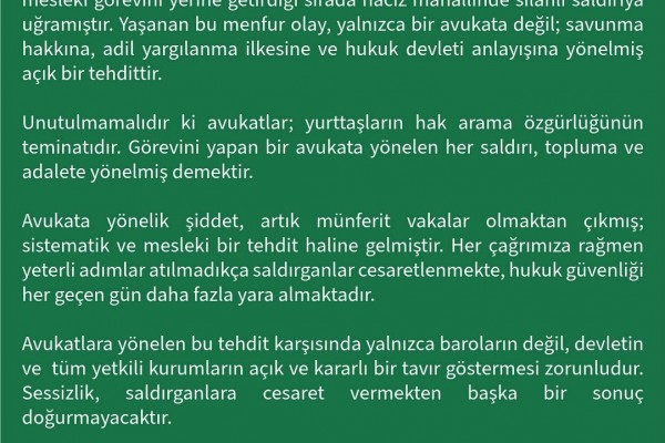 Avukatlara yönelen bu tehdit karşısında yalnızca baroların değil, devletin ve tüm yetkili kurumların açık ve kararlı bir tavır göstermesi zorunludur. Sessizlik, saldırganlara cesaret vermekten başka bir sonuç doğurmayacaktır.