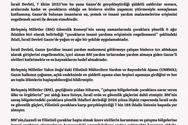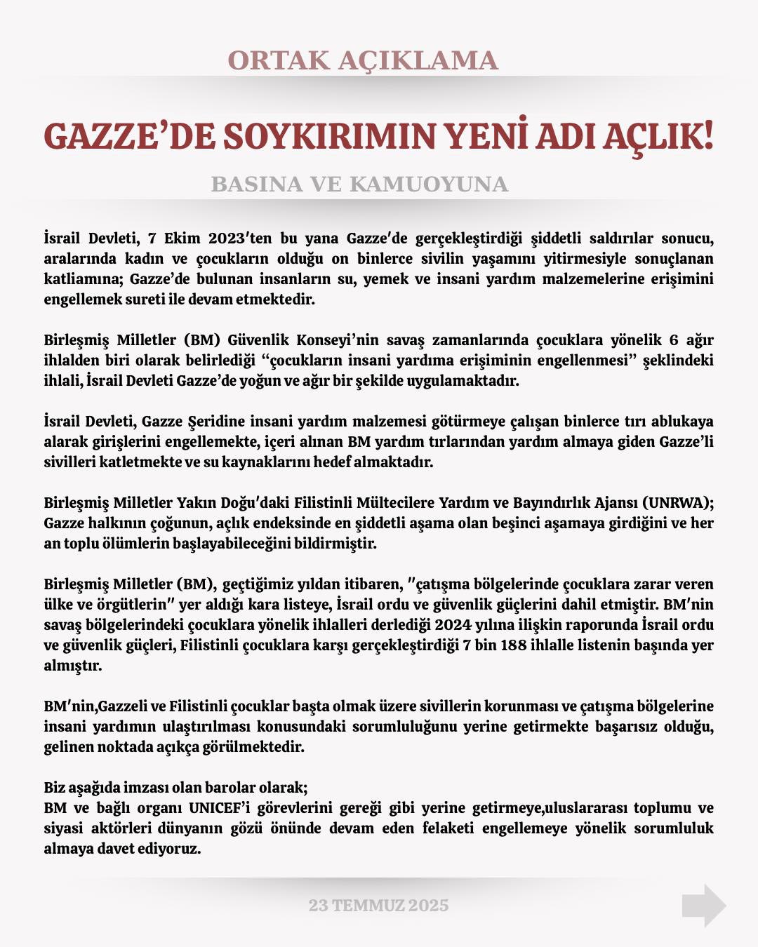 Barolardan Ortak Açıklama: Gazze’de Soykırımın Yeni Adı Açlık! 23.07.2025 140 Görüntüleme 23.07.2025 140 Görüntüleme