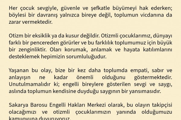 Sakarya Barosu Engelli Hakları Merkezi olarak, bu olayın takipçisi olacağımızı ve otizmli çocuklarımızın yanında olduğumuzu kamuoyuna duyuruyoruz.