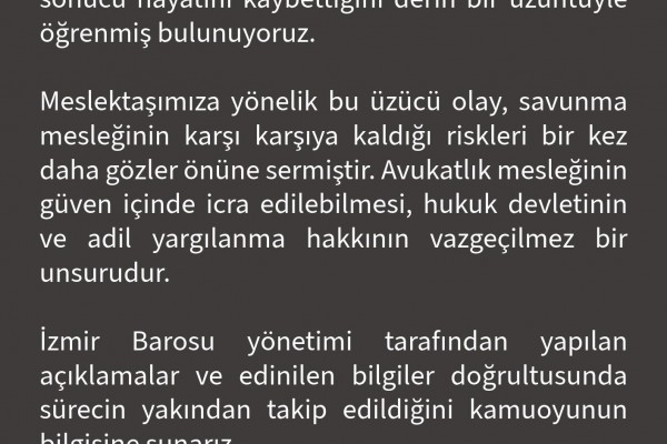 Hayatını kaybeden meslektaşımıza Allah’tan rahmet; ailesine, yakınlarına, İzmir Barosu’na ve tüm meslektaşlarımıza sabır ve başsağlığı diliyoruz.