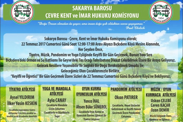 Sakarya Barosu - Çevre, Kent ve İmar Hukuku Komisyonu tarafından 22 Temmuz 2017 cumartesi günü saat 12:00-17:00 arası Akyazı Bıçkıdere Köyü Mesire Alanında düzenlenecek olan etkinliğimize tüm meslektaşlarımızı ve Sakaryalı halkımızı, çocukları ile birlikte keyifli ve öğretici bir gün geçirmek üzere etkinliğimize bekliyoruz.