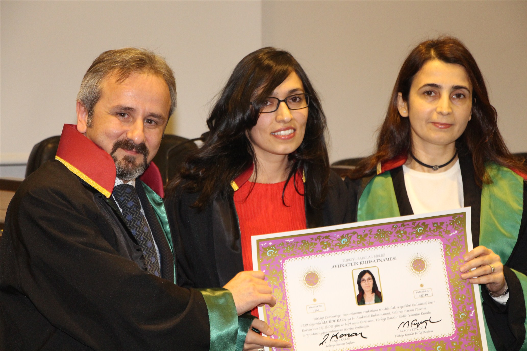 Sakarya Barosu Stajyer Avukatları Ayşe Topaloğlu ve Mahide Kara Baro Hizmet Binası Konferans Salonunda düzenlenen törende yemin ederek ruhsatnamelerini aldılar.
