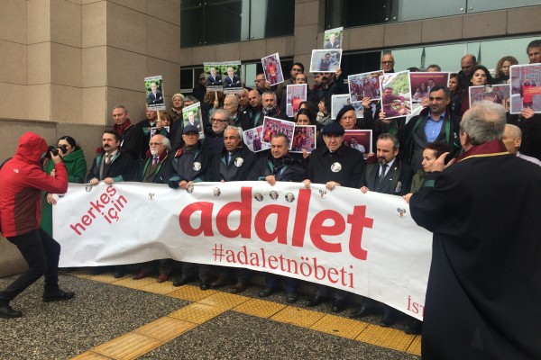 Cumhuriyet Gazetesi davası süresince tutuklu bulunan gazeteciler ve avukatlar için her hafta Perşembe günü Çağlayan Adliyesinde bir araya gelen ve basın açıklaması yapan avukatlar adalet nöbeti tutmaya devam ediyor. Bu hafta, 51. Haftasını dolduran adalet nöbetine katılan Sakarya Barosu Başkanı Av. Zafer Kazan 19 ilin baro başkanlarının Soma Davası ile ilgili imzaladığı bildiriyi okudu.
