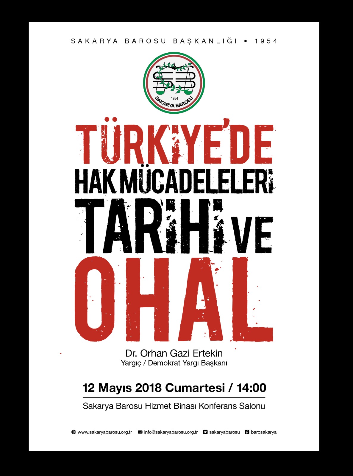 12 Mayıs Cumartesi günü saat 14.00’da Baromuz Konferans Salonunda, sunumunu Demokrat Yargı Başkanı Yargıç Dr. Orhan Gazi Ertekin’in yapacağı “Türkiye’de Hak Mücadeleleri Tarihi ve OHAL” konulu panelimize meslektaşlarımız ve tüm vatandaşlarımız davetlidir.