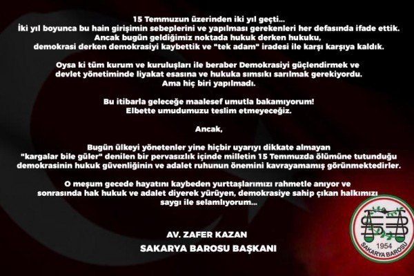 BARO BAŞKANIMIZ AV. ZAFER KAZAN'IN 15 TEMMUZ MESAJI