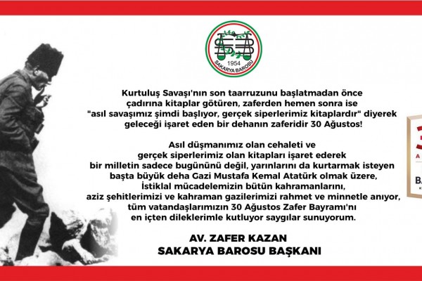 Kurtuluş Savaşı'nın son taarruzunu başlatmadan önce çadırına kitaplar götüren, zaferden hemen sonra ise "asıl savaşımız şimdi başlıyor, gerçek siperlerimiz kitaplardır" diyerek geleceği işaret eden bir dehanın zaferidir 30 Ağustos! Asıl düşmanımız olan cehaleti ve gerçek siperlerimiz olan kitapları işaret ederek bir milletin sadece bugününü değil, yarınlarını da kurtarmak isteyen başta büyük deha Gazi Mustafa Kemal Atatürk olmak üzere, İstiklal mücadelemizin bütün kahramanlarını, aziz şehitlerimizi ve kahraman gazilerimizi rahmet ve minnetle anıyor, tüm vatandaşlarımızın 30 Ağustos Zafer Bayramı'nı en içten dileklerimle kutluyor saygılar sunuyorum.