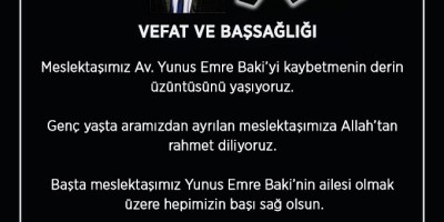 Meslektaşımız Av. Yunus Emre Baki’yi kaybetmenin derin üzüntüsünü yaşıyoruz. Genç yaşta aramızdan ayrılan meslektaşımıza Allah’tan rahmet diliyoruz. Başta meslektaşımız Yunus Emre Baki&rsq...
