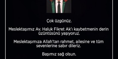 Meslektaşımız Av. Haluk Fikret Ak’ı kaybetmenin derin üzüntüsünü yaşıyoruz. Meslektaşımıza Allah’tan rahmet, ailesine ve tüm sevenlerine sabır dileriz. Başımız sağ olsun. Meslekta...